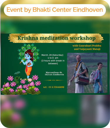 Krishna meditation by Gaurahari prabhu and his wife Vaijayanti mataji. The devotee couple live in Golokadham temple in Germany. As a part of their NL tour, they are going take us through a transformative meditative workshop. Kindly request all of you to block the calendars to attend this event!